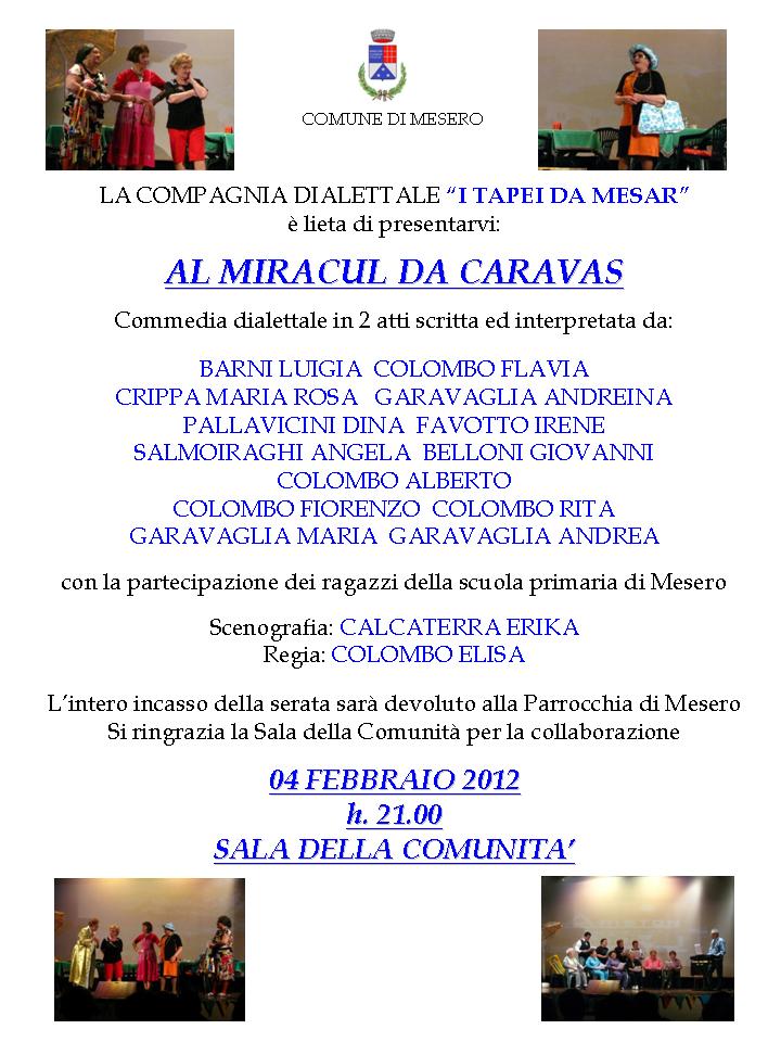 sabato 4 febbraio ore 21.00 presso Sala della Comunità "Al miracul da Caravas", spettacolo teatrale in dialetto meserese.