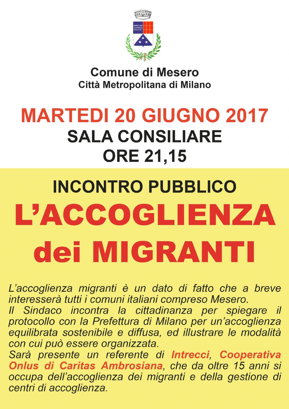Martedì 20 giugno alle ore 21,15 presso la SALA CONSILIARE del Municipio, si terrà un incontro pubblico sulla tematica dell'accoglienza dei migranti in cui sarranno spiegate le modalità di accoglienza e verrà illustrato il protocollo con la prefettura.
