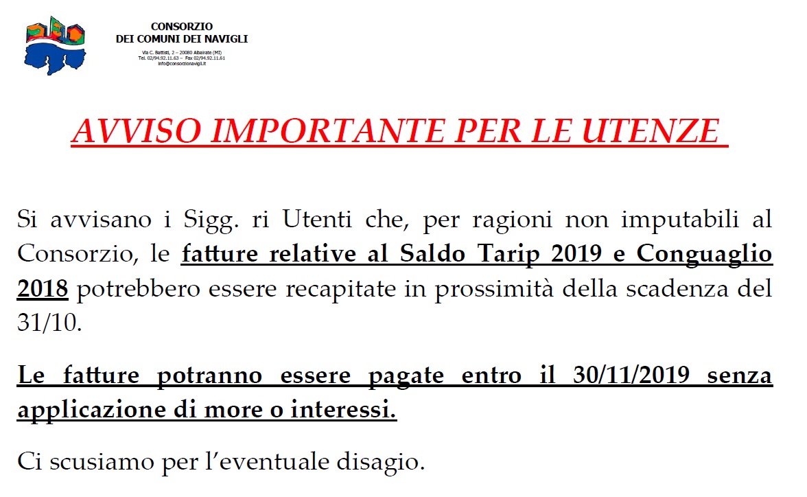 Si avvisano i Sigg. ri Utenti che, per ragioni non imputabili al Consorzio, le fatture relative al Saldo Tarip 2019 e Conguaglio 2018 potrebbero essere recapitate in prossimità della scadenza del 31/10.