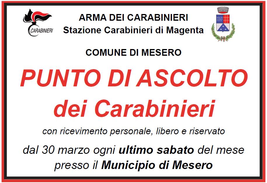 Si comunica che è attivo il PUNTO DI ASCOLTO dei Carabinieri, un servizio, organizzato dalla Stazione dei Carabinieri di Magenta in collaborazione col Comune di Mesero, rivolto a tutti coloro che hanno la necessità di rapportarsi con i Carabinieri in maniera riservata consentendo loro di farlo direttamente a Mesero.
