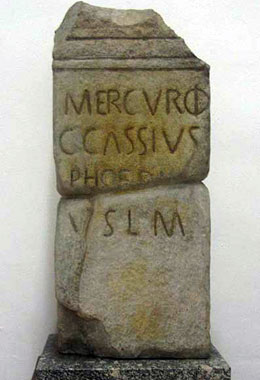 L'iscrizione è su quattro righe in carattere capitale: la terza riga, in corpo minore, è decifrabile solo per le prime lettere PHO, l'inizio probabilmente del cognomen romano dell'offerente.