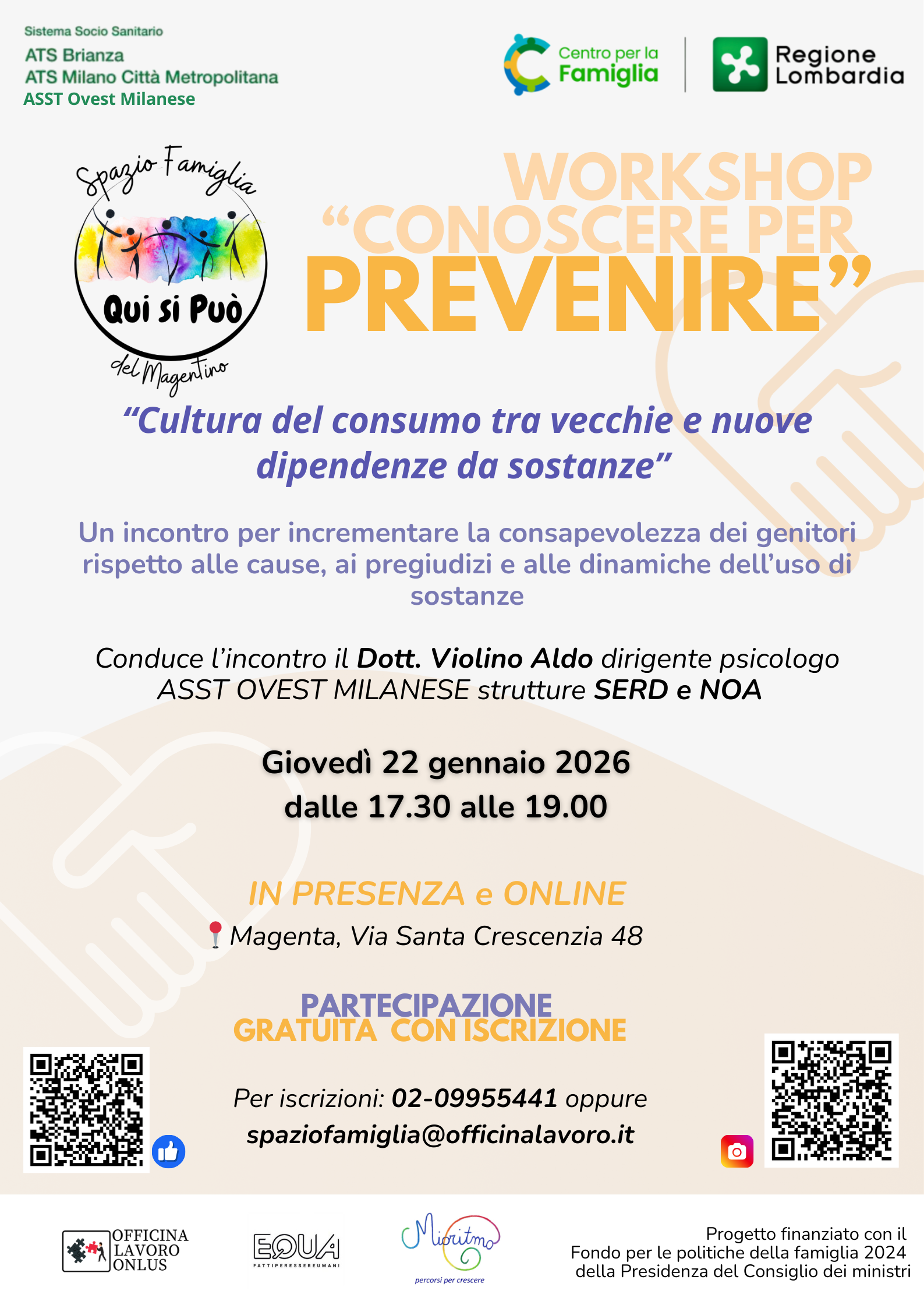 "Giovedì 22 gennaio alle ore 17:30 si terrà il Workshop “Conoscere per prevenire”, dedicato al tema delle dipendenze da sostanze psicotrope.