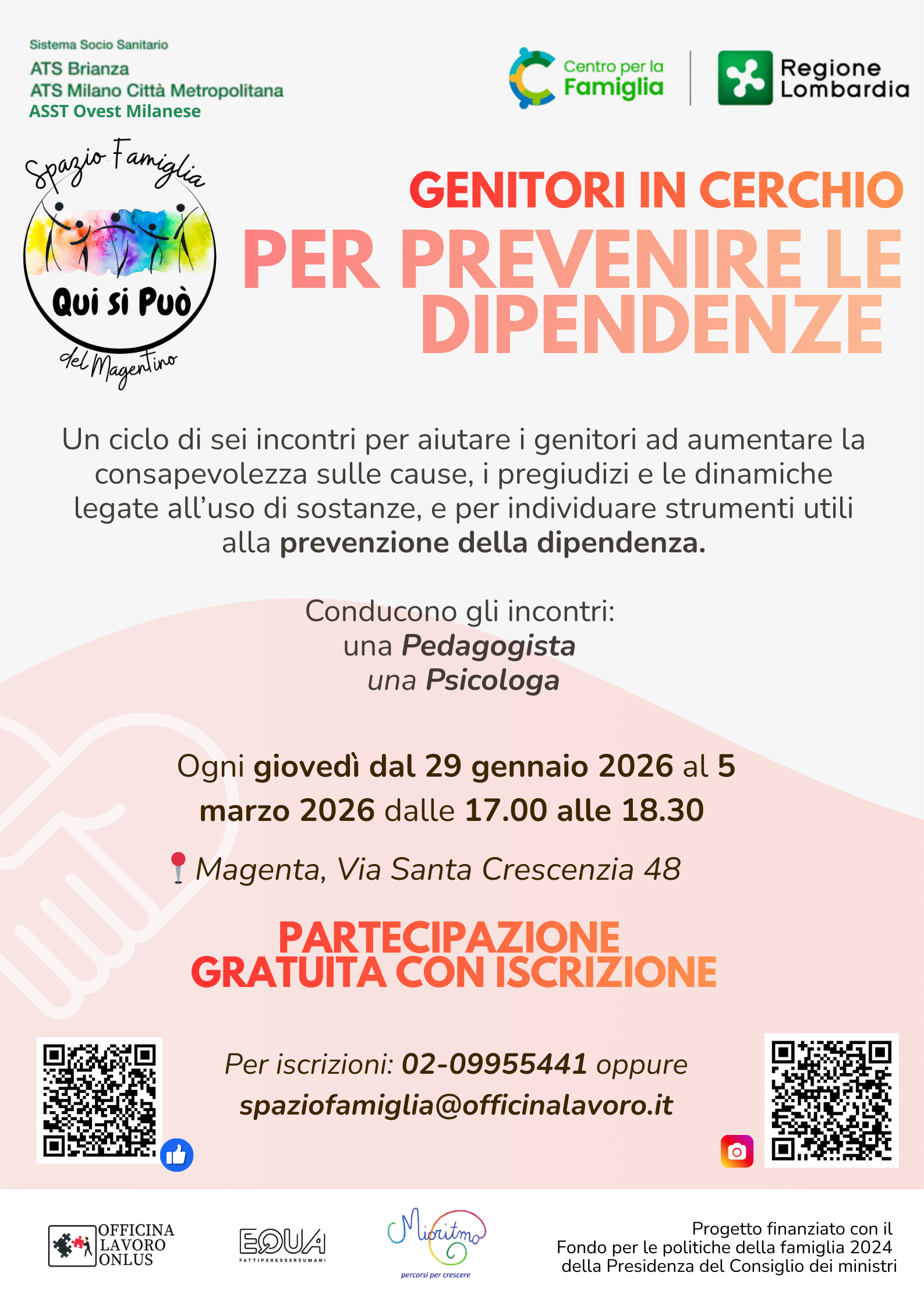 A seguire, è prevista la partenza del gruppo “Genitori in cerchio per prevenire le dipendenze”, condotto da una pedagogista e da una psicologa dell’equipe di Spazio Famiglia.